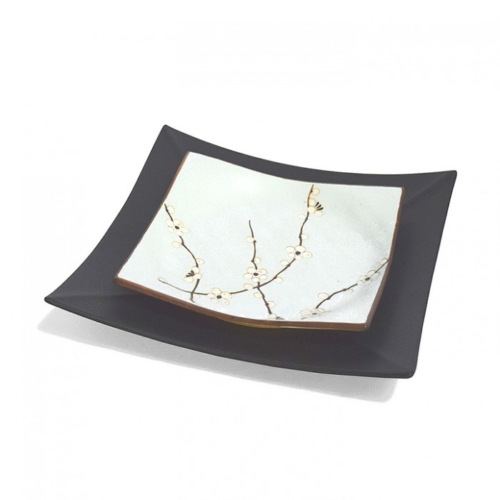 L'assiette carrée japonaise est pratique pour des présentations plus géométriques, mais elle garde son aspect traditionnel de branches et de fleurs sur une tonalité menthe à l'eau.