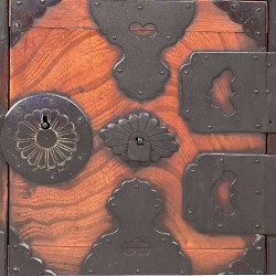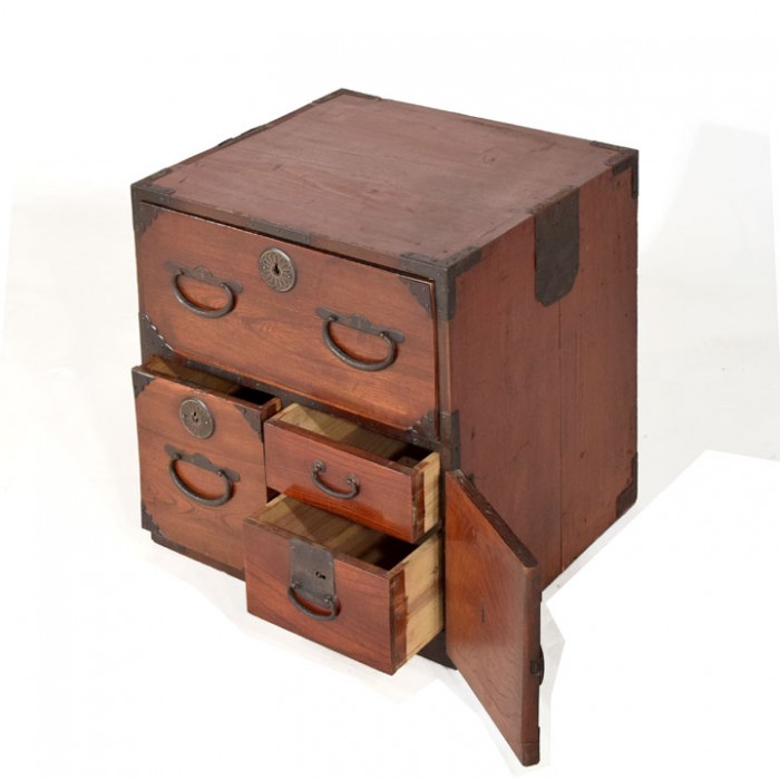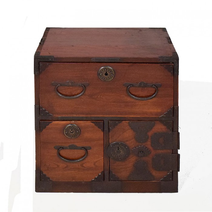 Petit meuble japonais à 2 tiroirs et 2 petits tiroirs derrière la porte, en bon état.