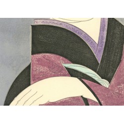 Tiré de la scène "Tokaiya" de la pièce de kabuki Yoshitsune Senbon Zakura, jouée au Kabuki-za. Le "155" dans le coin supérieur gauche indique qu'il s'agit du 155ème design de Kokei.