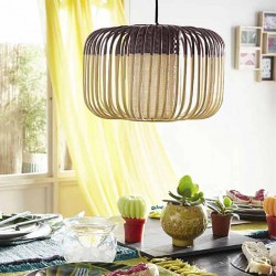 Naturelle, élégante et moderne, cette suspension aux minutieuses finitions, est composée d'un cylindre en bambou, entouré de baguettes plates, en intervalles régulières formant l'abat-jour.