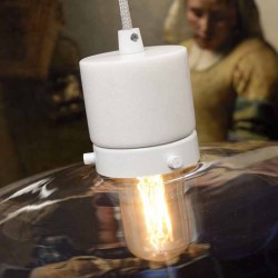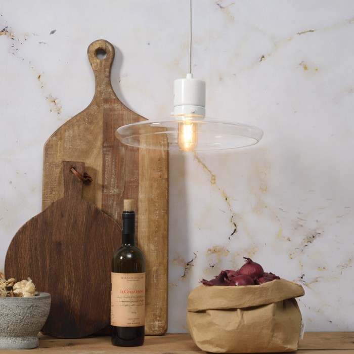 La suspension traditionnelle, mais toujours moderne ! L'abat-jour en verre est fixé au câble par une douille redessinée en marbre. Elle éclaire parfaitement une chambre ou une cuisine, de tous style et décoration.