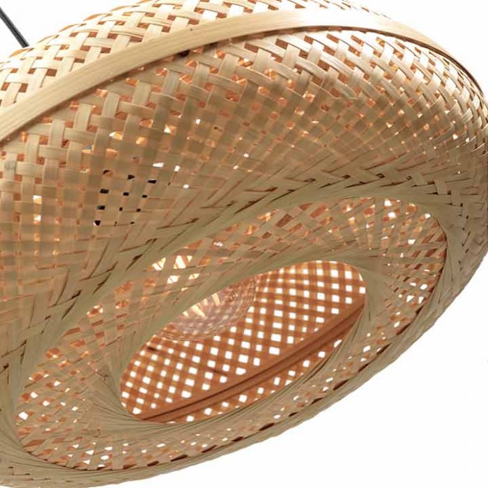 La suspension PALAWAN est réalisée artisanalement. Elle offre une lumière agréable, une ambiance chaleureuse, et apporte aussi une touche très naturelle ou plus loft en teinté noir.