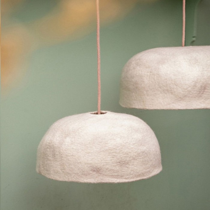 Suspension en feutre de laine, disponible en trois dimensions (Ø 30 cm, 40 cm et 50 cm) et quatre couleurs (naturel, sable-naturel, quartz-or et quartz-orange).