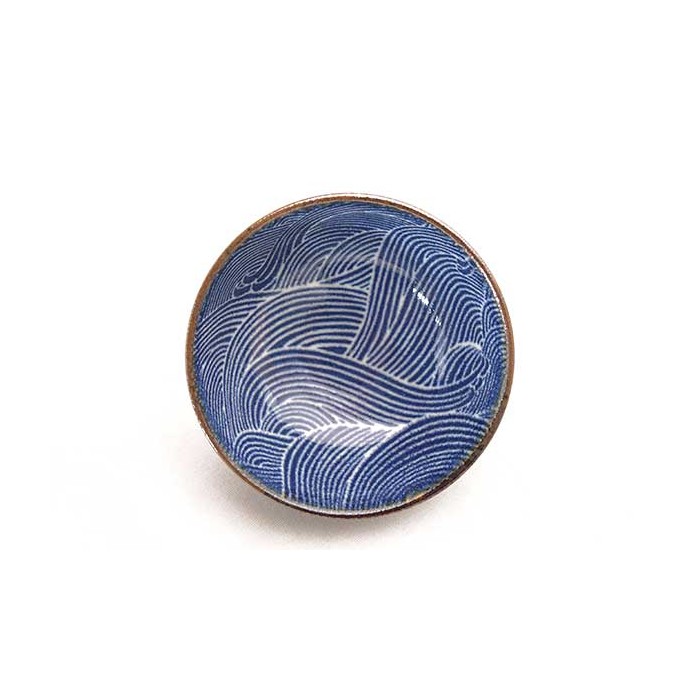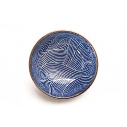 Bol en porcelaine émaillée bleu indigo avec motifs vagues blanches.