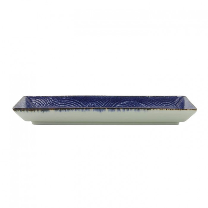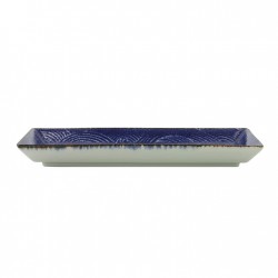 Plat rectangulaire émaillée bleu indigo avec motifs vagues blanches.