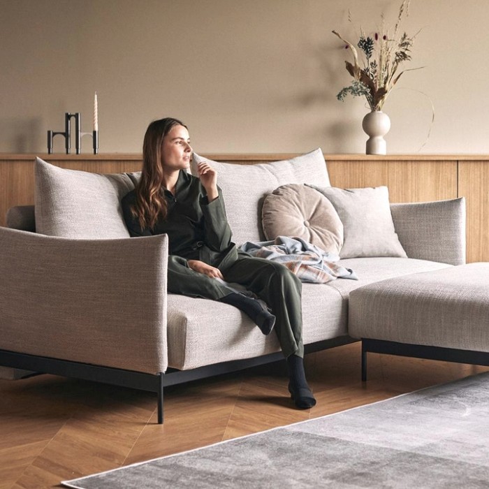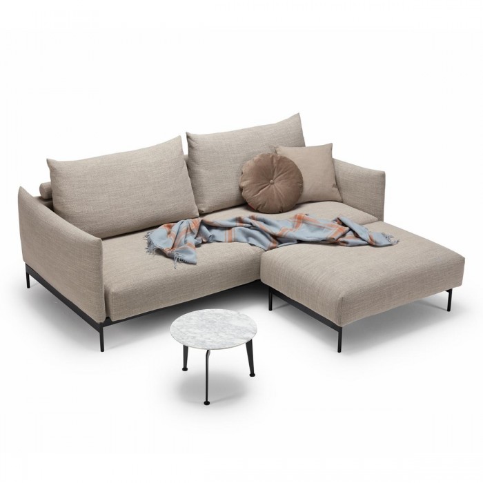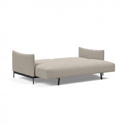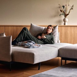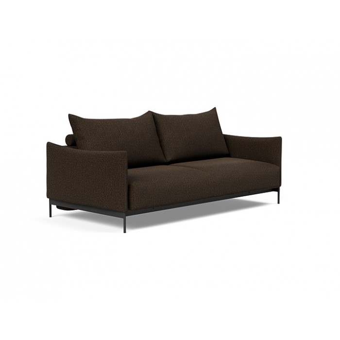 Le canapé MALLOY est monté sur une structure en métal robuste. Très confortable assis avec ses accoudoirs souples, il se transforme en lit la nuit. La literie et les couvertures peuvent être facilement rangées dans le coffre. En lit, Malloy mesure 150 x 200 cm.