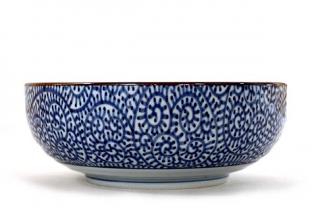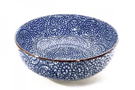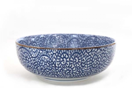 Saladier en grès fin blanc avecun décor en petites spirales bleues " tako".