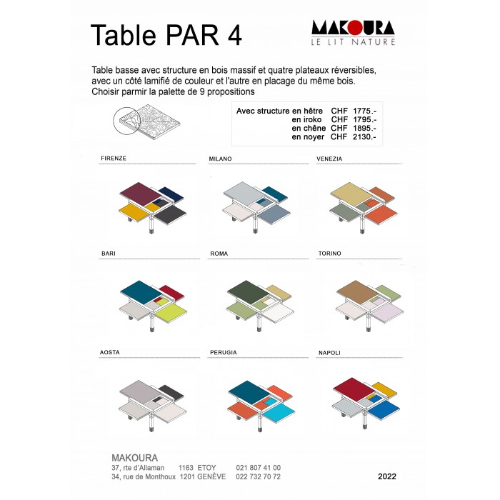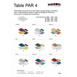 Table basse avec structure en hêtre massif et quatre plateaux réversibles (dessus en lamifié couleur et dessous en placage hêtre). Choisir une couleur pour la structure en bois et ensuite les couleurs à choix pour les plateaux, jusqu'à huit couleurs différentes. Voir toutes les propositions de bois et de couleur sur: https://www.sculpturesjeux.com/fr/produits/catalogues/par4-h40.html