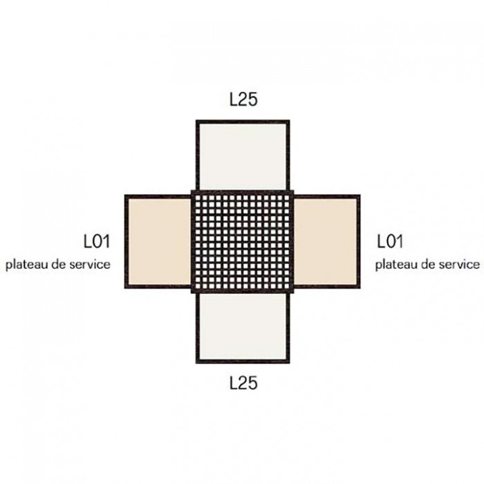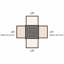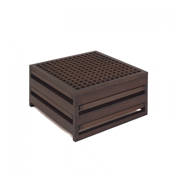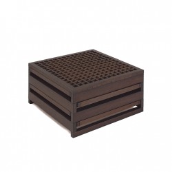 Table basse avec structure en iroko massif teinté wengé et 4 plateaux réversibles et amovibles. La partie supérieure est un plateau en caillebotis de bois massif. Tous les plateaux ont un rebord en bois massif sur le périmètre, une face est en stratifié lisse à fleur du rebord et l'autre face est un plateau de service, en creux. La finition de la structure est toujours la même que celle du rebord du plateau.