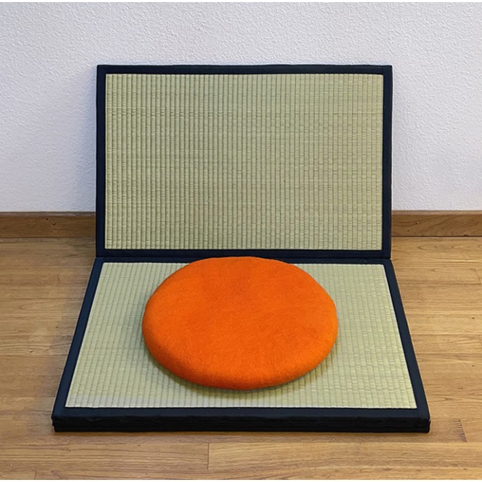 Tatami pliable en quatre parties. Très pratique pour le rangement, il crée l’atmosphère d'une chambre japonaise quand il est ouvert. La surface visible est en goza naturel, le corps du tatami est en panneau synthétique, ainsi il est léger. Idéal pour la méditation avec un zafu ou pour les massages avec futon shiatsu.