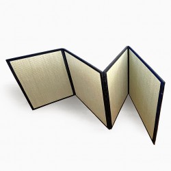 Tatami pliant en quatre parties. Très pratique pour le rangement, il crée l’atmosphère d'une chambre japonaise quand il est ouvert. La surface visible est en goza naturel, le corps du tatami est en panneau synthétique, ainsi il est léger. Idéal pour la méditation avec un zafu ou pour les massages avec futon shiatsu.