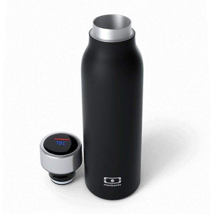 Grâce à son bouchon muni de capteurs la bouteille intelligente isotherme MB Genius indique le niveau de chaleur/fraîcheur et la température (°C) précise de la boisson contenue.