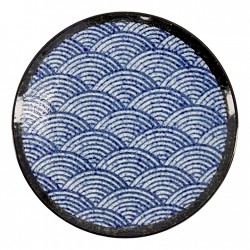 Plat japonais ou grande assiette plate en grès fin, décoré du motif traditionnel de vagues bleues.