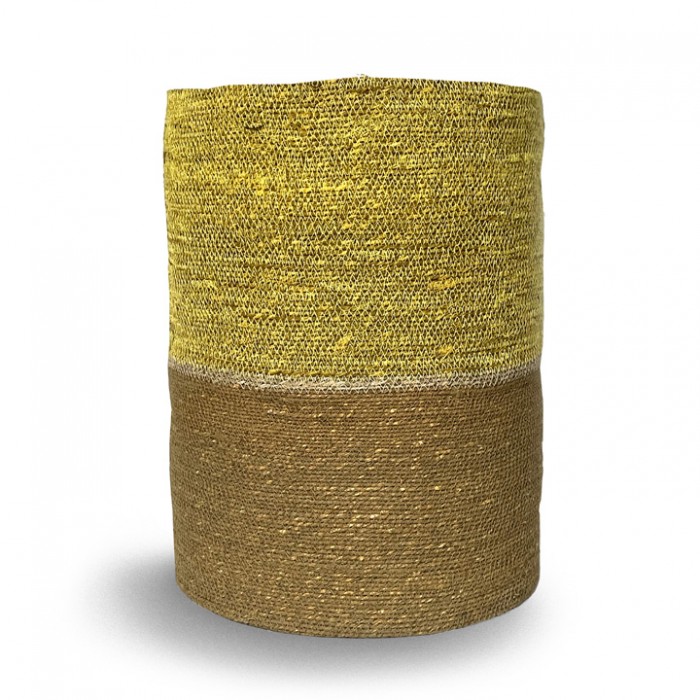 Grande panière ou corbeille à papier, en jacinthe d'eau de forme cylindrique, bicolore sienne-curry.