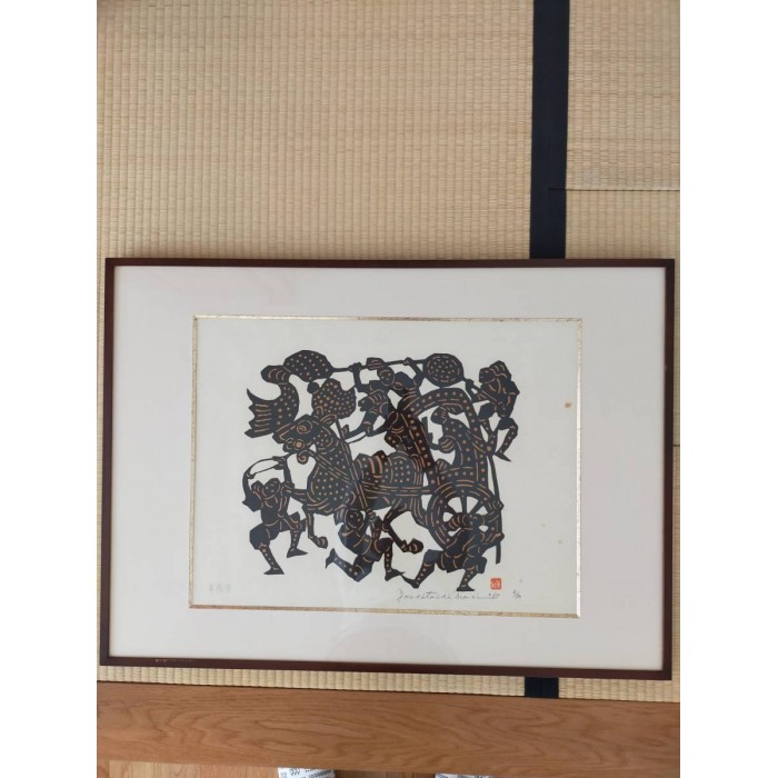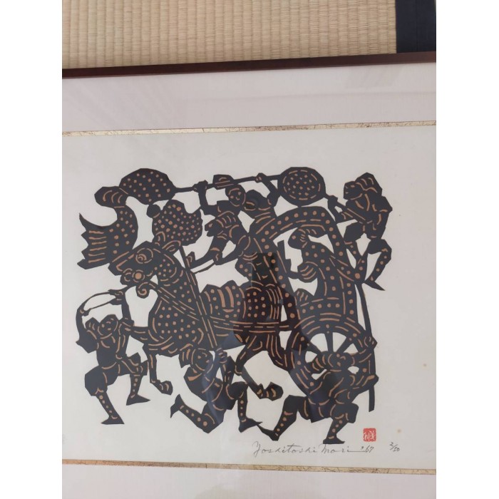 Yoshitoshi Mori was a 20th century Japanese artist who specialized in kappazuri stencil prints. For many years he belonged to the Mingei folk craft movement, where he produced stencil-dyed textiles and other textile arts. It was not until the 1950s that Mori began to work with paper, yet he quickly became known as one of the foremost artists of the Sosaku Hanga movement. Yoshitoshi Mori is said to have influenced several major 20th century print artists, including Shiko Munakata and Hiromitsu Takahashi.