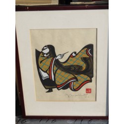Yoshitoshi Mori was a 20th century Japanese artist who specialized in kappazuri stencil prints. For many years he belonged to the Mingei folk craft movement, where he produced stencil-dyed textiles and other textile arts. It was not until the 1950s that Mori began to work with paper, yet he quickly became known as one of the foremost artists of the Sosaku Hanga movement. Yoshitoshi Mori is said to have influenced several major 20th century print artists, including Shiko Munakata and Hiromitsu Takahashi.
