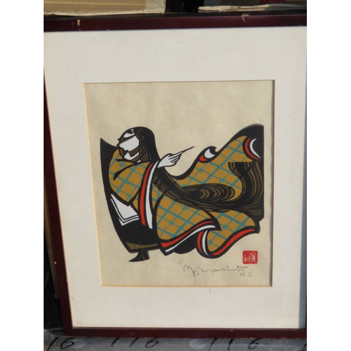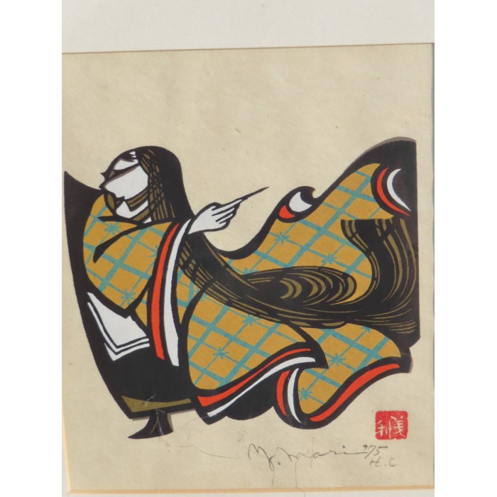 Mori's stencil prints depict the past world of Tokyo's plebeian lowlands, the so-called Shitamachi, with its festivals, craftsmen and women of the demimonde. The mainstay of his great talent lies in his ability to not merely capture detail, but to boldly evoke emotions through his highly stylized designs.