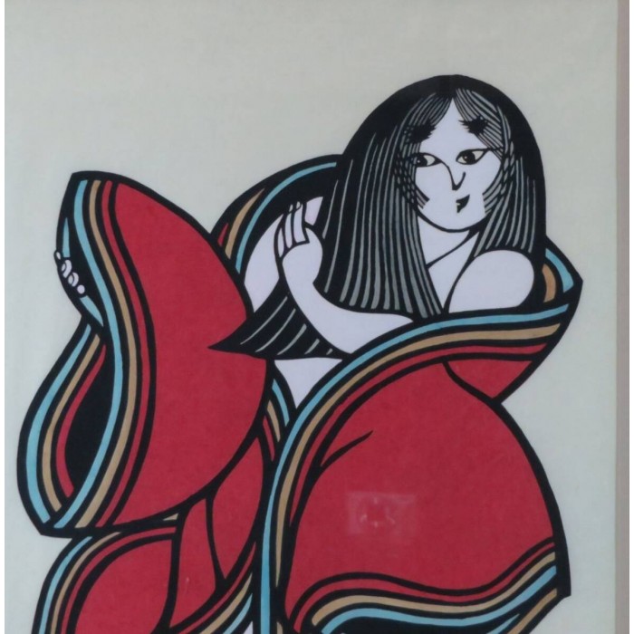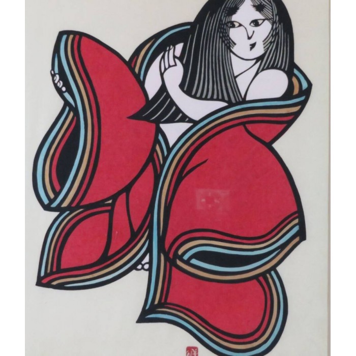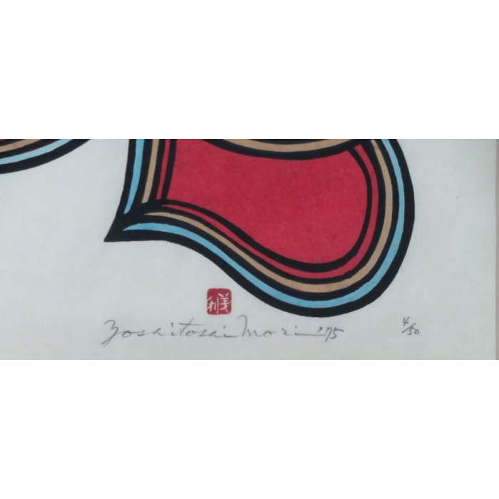 Yoshitoshi Mori was a 20th century Japanese artist who specialized in kappazuri stencil prints. For many years he belonged to the Mingei folk craft movement, where he produced stencil-dyed textiles and other textile arts. It was not until the 1950s that Mori began to work with paper, yet he quickly became known as one of the foremost artists of the Sosaku Hanga movement. Yoshitoshi Mori is said to have influenced several major 20th century print artists, including Shiko Munakata and Hiromitsu Takahashi.