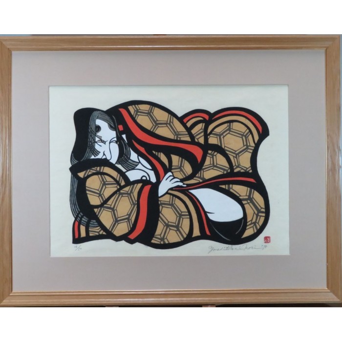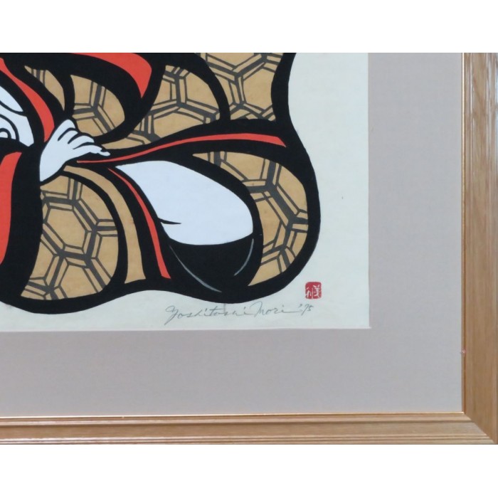 Yoshitoshi Mori was a 20th century Japanese artist who specialized in kappazuri stencil prints. For many years he belonged to the Mingei folk craft movement, where he produced stencil-dyed textiles and other textile arts. It was not until the 1950s that Mori began to work with paper, yet he quickly became known as one of the foremost artists of the Sosaku Hanga movement. Yoshitoshi Mori is said to have influenced several major 20th century print artists, including Shiko Munakata and Hiromitsu Takahashi.