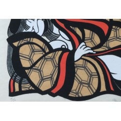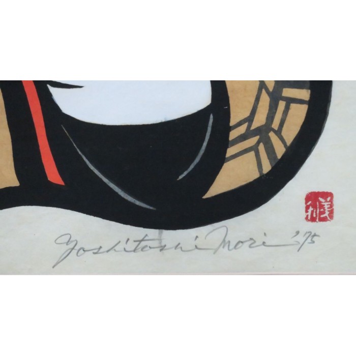 Mori's stencil prints depict the past world of Tokyo's plebeian lowlands, the so-called Shitamachi, with its festivals, craftsmen and women of the demimonde. The mainstay of his great talent lies in his ability to not merely capture detail, but to boldly evoke emotions through his highly stylized designs.