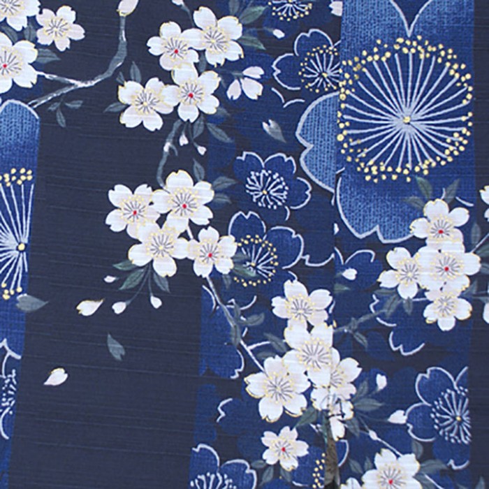 Le kimono yukata traditionnel japonais en coton, décor sur fond bleu de fleurs de cerisiers. Une ceinture est assortie. le ceinture.