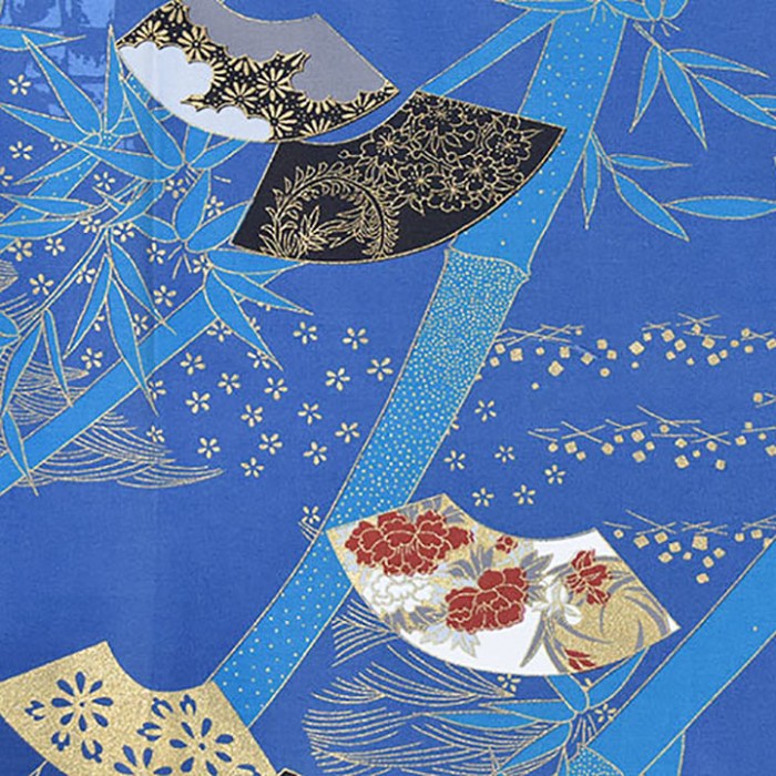 Les motifs représentent des éventails ouverts aux motifs graphiques japonais, sur un fond drapé bleu.