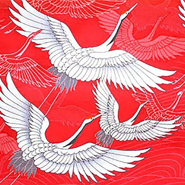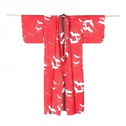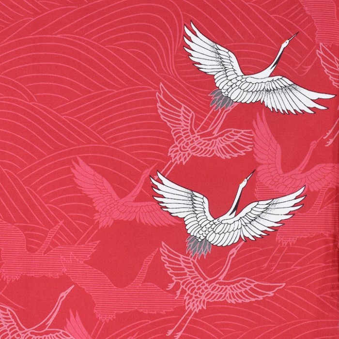 Très féminin, les motifs représentent un envol de grues; au Japon, elles ont la particularité d'être blanches et noires avec le haut de la tête rouge et symbolisent la longévité, la fidélité et la bonne fortune. Le yukata est aussi utilisé dans de nombreuses occasions, dans les festivals, après le bain, mais aussi comme tenue d'été.